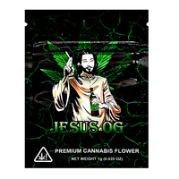 Buy premium 1 gram exotic design mylar bags in the 'Jesus OG' style - premium shelf appeal, smell proof, resealable, and heat sealable for superior odor control and freshness, best-in-class freshness. Each child resistant mylar pouch features high-resolution printing and moisture resistant barrier film, perfect for herb flower, edibles, or concentrates. Vacuum seal compatible and ideal for dispensary packaging, growers, and smoke shop wholesale suppliers. Order 100 with fast nationwide shipping and wholesale pricing.