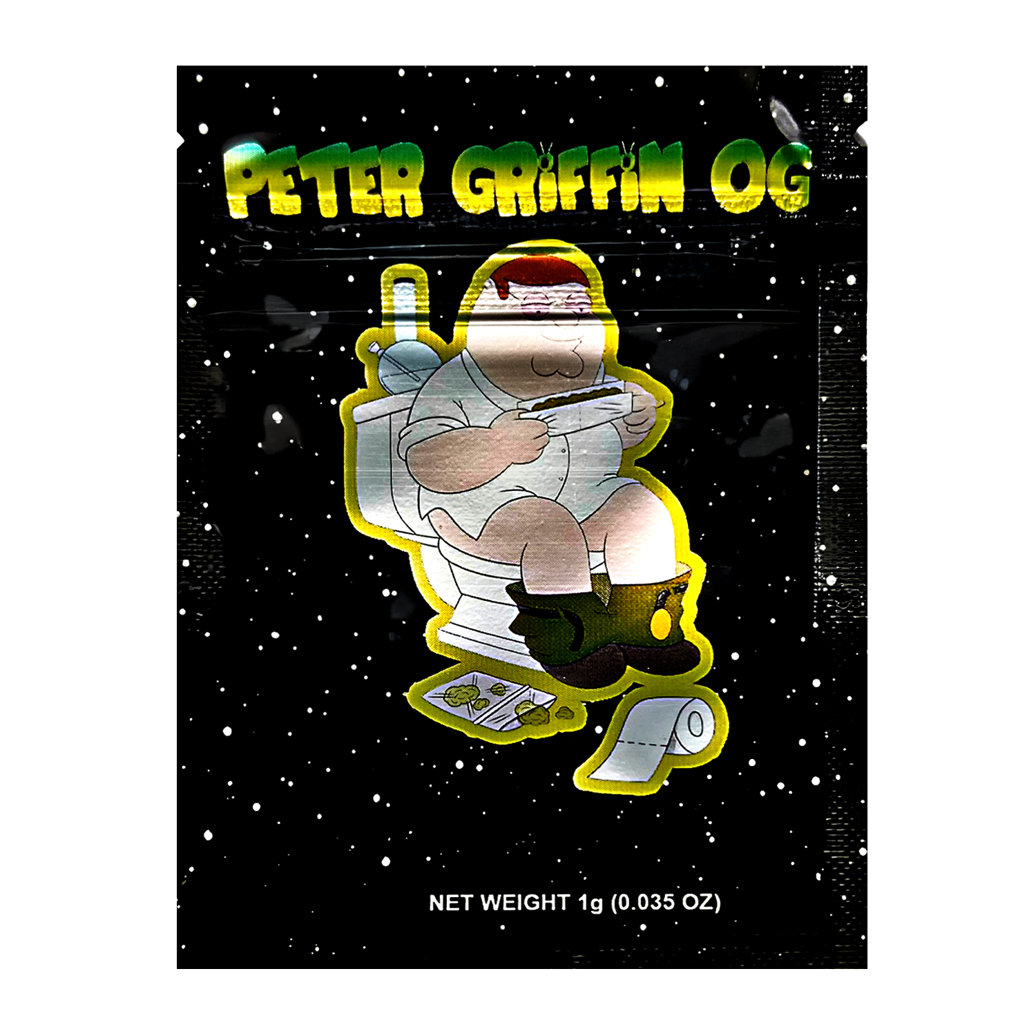 Level up your packaging with our 1G exotic design mylar bags featuring the 'Peter Griffin OG' artwork - brand-forward presentation, resealable, smell proof, and child resistant for compliant canabis packaging, long-term storage performance. These heat sealable, moisture proof pouches keep product potent and shelf-ready, and are compatible with vacuum sealing for long-term storage. A favorite for dispensary packaging and wholesale bulk orders. Case includes 100; ships fast nationwide.