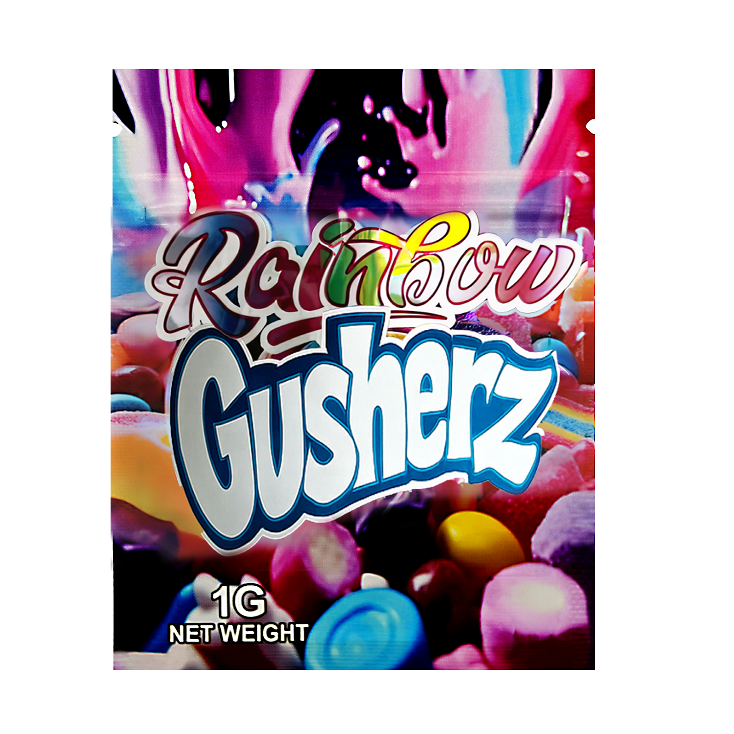 The Rainbow Gusherz edition features a clean, vibrant exotic design that brings instant recognition to your packaging lineup. Each 1-gram mylar bag includes a secure zipper closure and heat-sealable top for extended freshness. These exotic mylar bags combine Durable protection with bold color and collectible style.