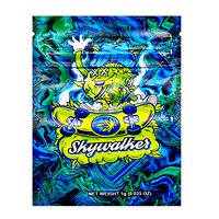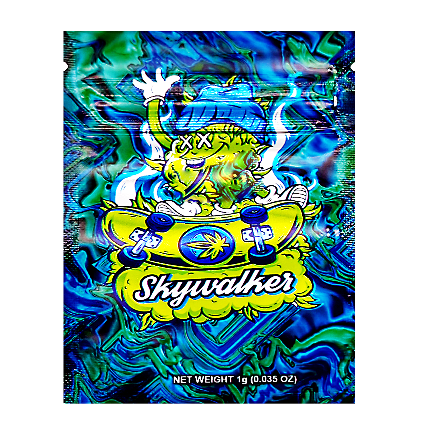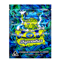 Stand out on the shelf with the 'Skywalker' 1G exotic mylar bag, consistent pouch quality. Built with a moisture resistant barrier and odor-control lining, these resealable, heat sealable, child resistant herb bags protect flower, edibles, and concentrates. Compatible with vacuum sealers and ideal for compliant dispensary packaging and wholesale orders. Case of 100; quick nationwide shipping.