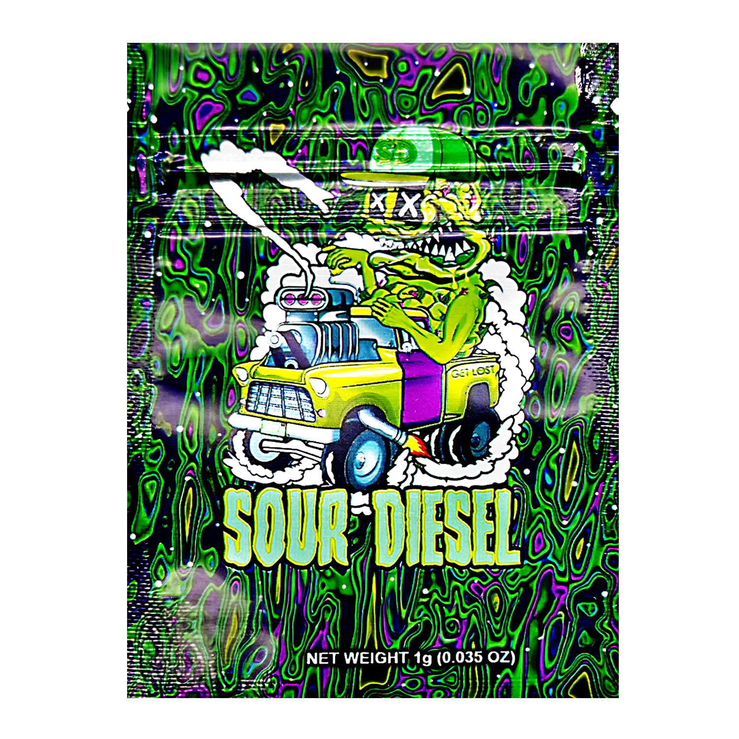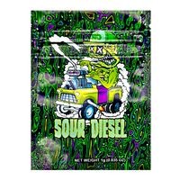 Go bold with 'Sour Diesel Truck' - eye-catching design, our 1 gram exotic design mylar bags are moisture proof, smell proof, and resealable for reliable odor control, bulk-friendly pricing. Each child resistant, heat sealable pouch features crisp printing and strong barrier protection for herb flower, edibles, or extracts. Vacuum seal ready and trusted by dispensaries, growers, and smoke shops. Packed 100 per case with bulk wholesale options and fast U.S. shipping.