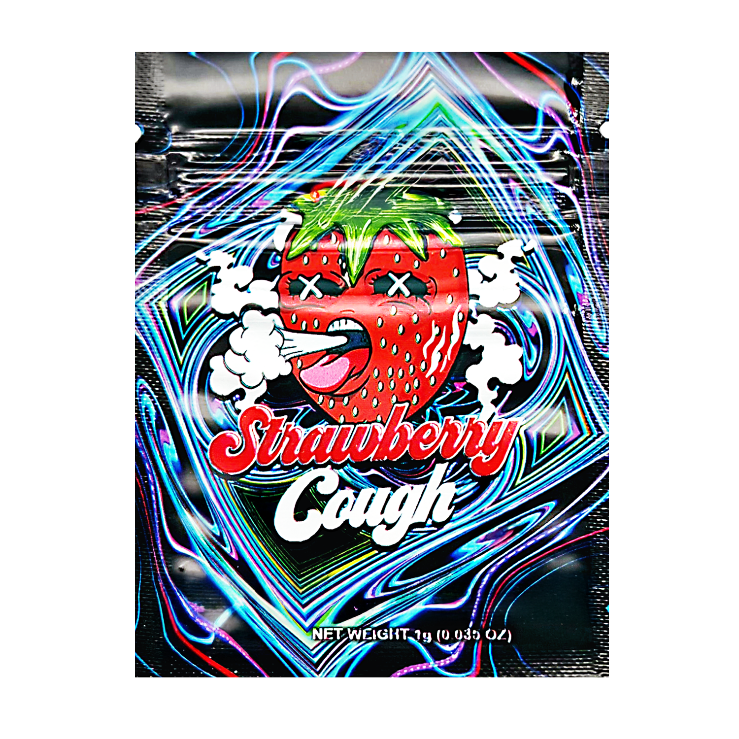 Buy Durable 1 gram exotic design mylar bags in the 'Strawberry Cough' style - Durable shelf appeal, smell proof, resealable, and heat sealable for superior odor control and freshness, best-in-class freshness. Each child resistant mylar pouch features high-resolution printing and moisture resistant barrier film, perfect for herb flower, edibles, or concentrates. Vacuum seal compatible and ideal for dispensary packaging, growers, and smoke shop wholesale suppliers. Order 100 with fast nationwide shipping and wholesale pricing.