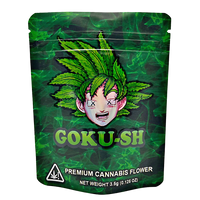 Order custom printed 3.5 gram mylar pouches - smell proof and vacuum seal compatible to keep flower fresh longer. Perfect for dispensary 1/8 oz flower, bulk herb distribution, and retail display. Featuring the eye-catching GOKU-SH Green theme for standout presentation Ready to ship nationwide with wholesale pricing and fast delivery.