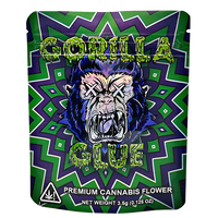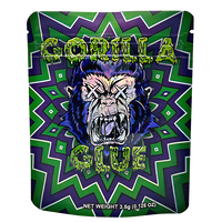 Order custom printed 3.5 gram mylar pouches - smell proof, moisture proof, and heat sealable for maximum freshness. Designed for eighth ounce herb flower in dispensaries, wholesale, and retail packaging. Featuring the eye-catching Gorilla Glue theme for standout presentation Offered at competitive wholesale rates with quick shipping across the country.