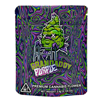 Order custom printed 3.5 gram mylar pouches - smell proof, moisture proof, and heat sealable for maximum freshness. Designed for eighth ounce herb flower in dispensaries, wholesale, and retail packaging. The Grandaddy Purple artwork delivers bold shelf appeal Ready to ship nationwide with wholesale pricing and fast delivery.