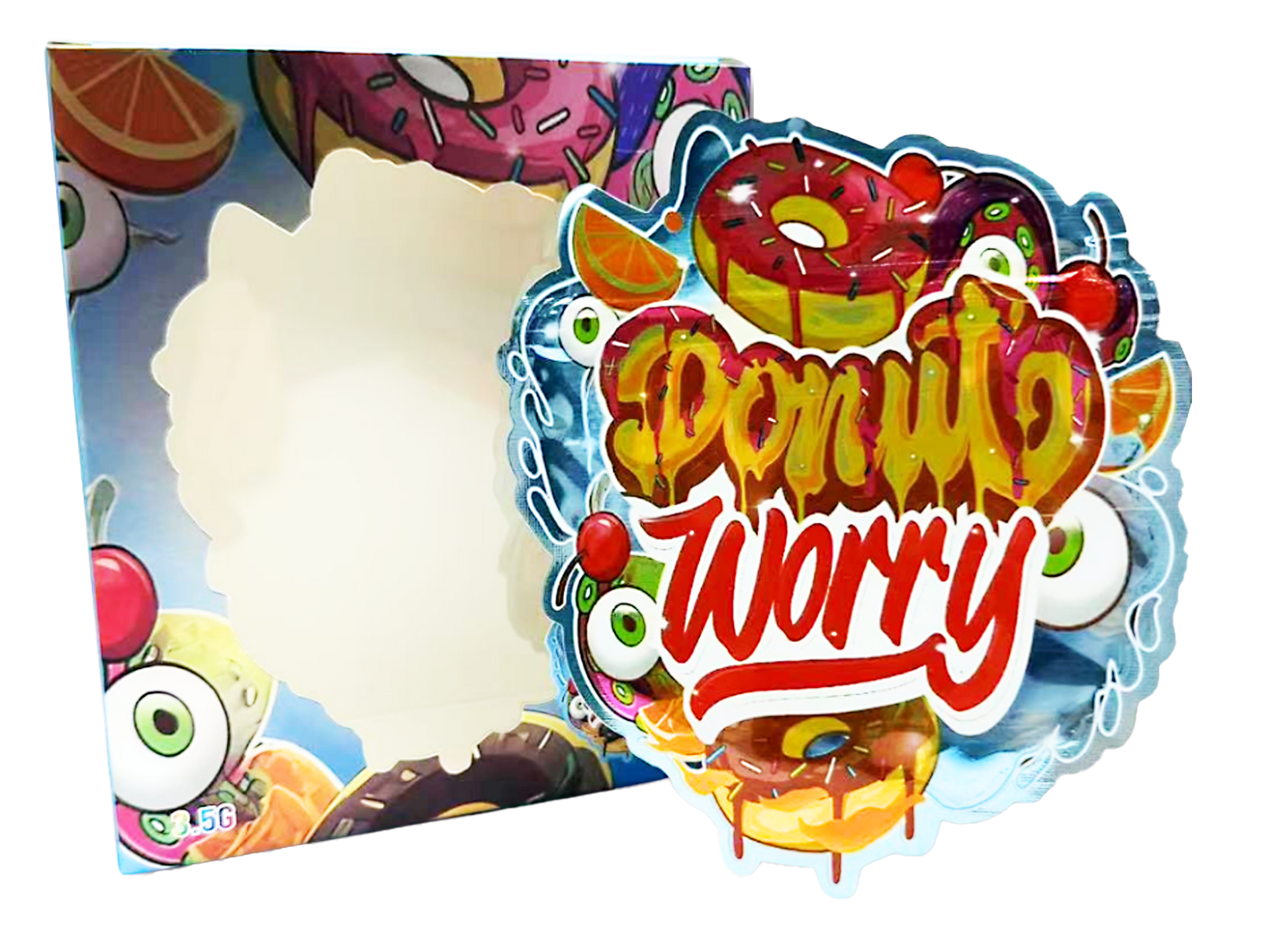 Upgrade your packaging lineup with the 3.5g Mylar Bag with Window Box Donut's Worry, a Durable-quality smell proof, resealable, and display-ready combo pack designed for freshness and standout appeal. Built from durable, multi-layer barrier film, these 3.5g mylar bags protect contents from air, moisture, and odor - perfect for brands focused on presentation and long-lasting quality.
