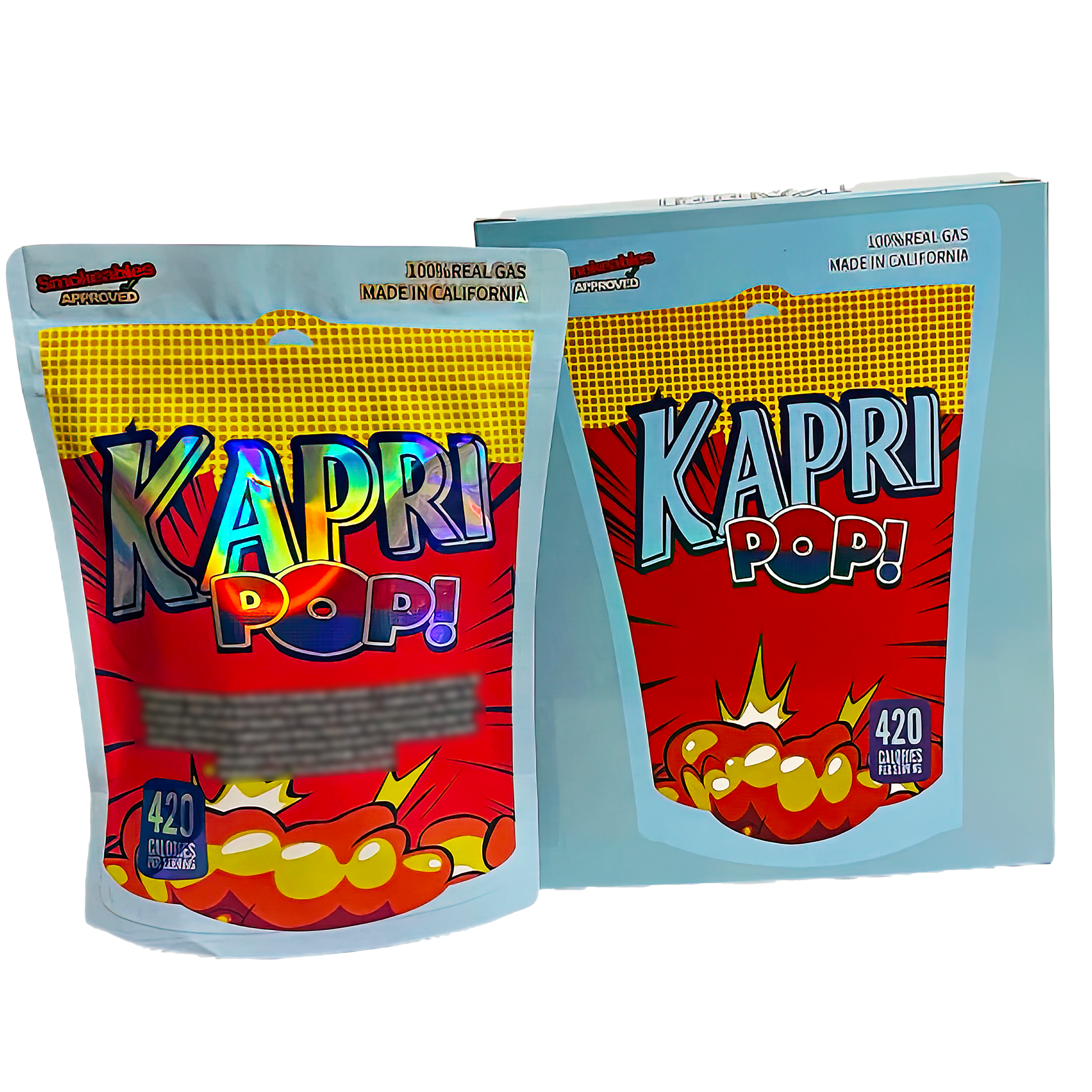 The Kapri Pop edition brings bold color and fun design to your Designer Mylar Bags lineup. Both the bag and window box are made from thick, durable Mylar Packaging Bags that help block air, moisture, and odor while maintaining a high-end, glossy finish.