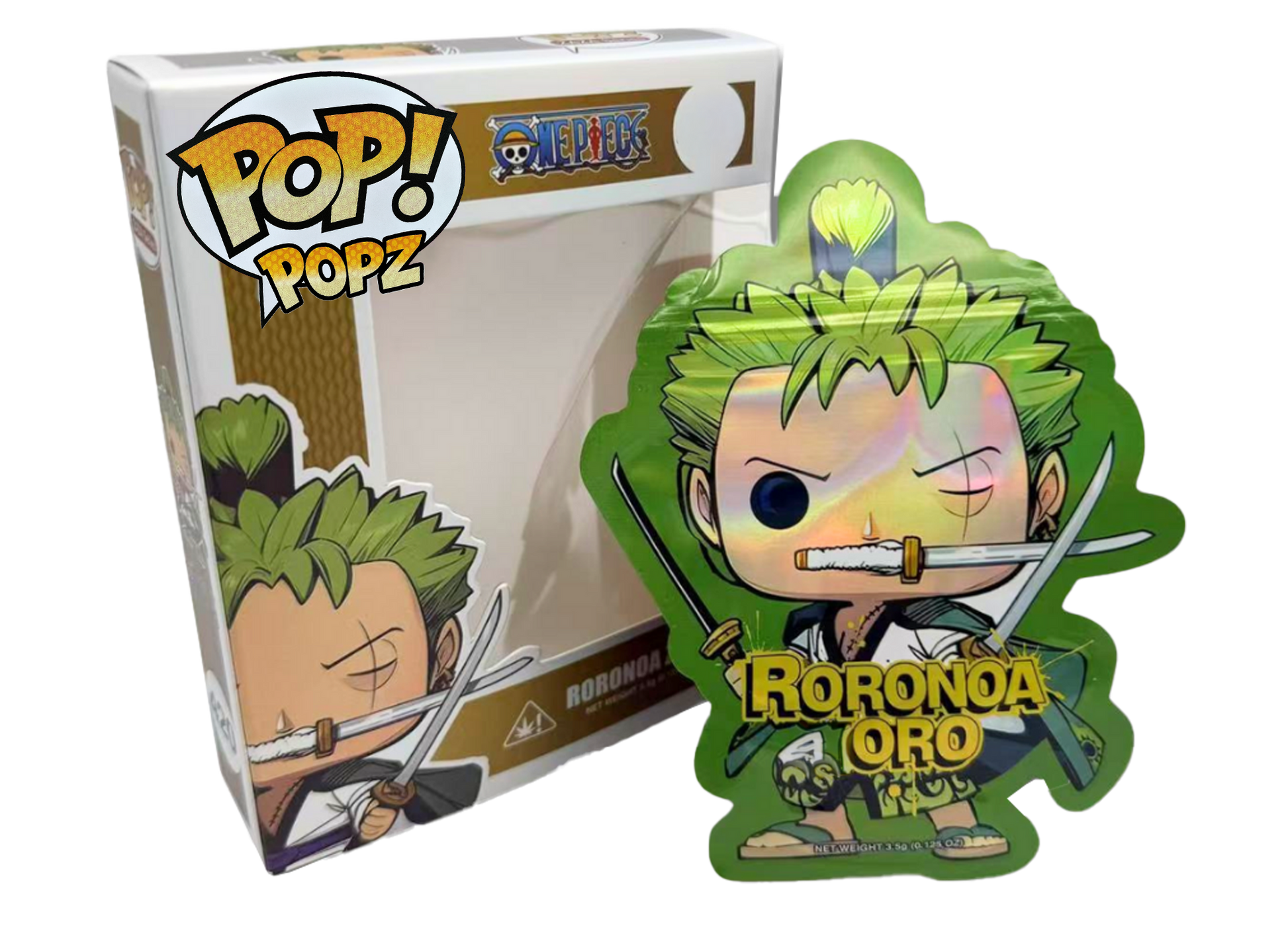 The POP One Piece Zoro 420 edition features a clean, vibrant design that brings instant recognition to your packaging lineup. Each combo pack includes a resealable mylar bag and a matching window display box, combining Durable protection with eye-catching presentation and collectible appeal.