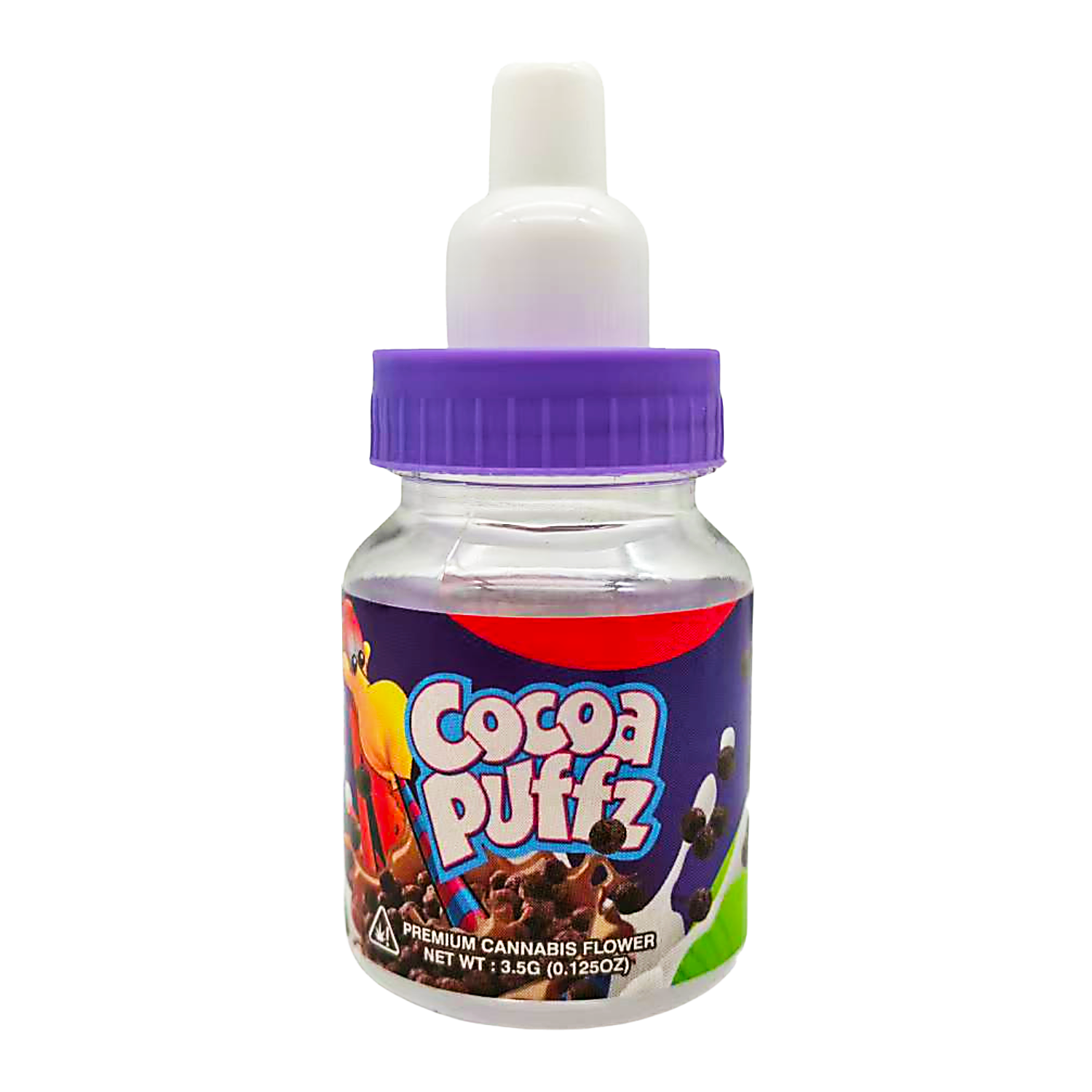 The Cocoa Puffz edition features a collectible bottle shape that brings instant recognition to your packaging lineup. Each 3.5g plastic jar includes a secure screw-on lid for freshness protection. These bottle jars combine premium durability with bold color and novelty appeal.