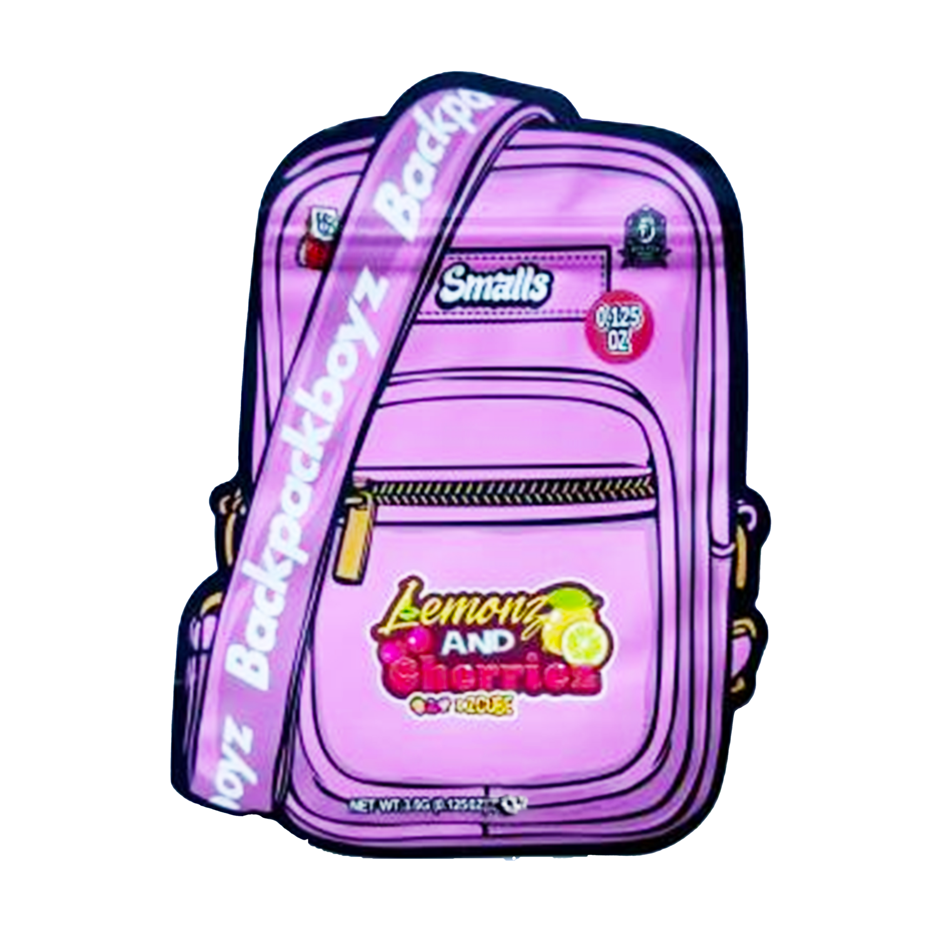 Buy Backpack Boyz Lemonz and Cherries 3.5 gram die cut shaped mylar bags - smell proof, moisture proof, heat sealable, and child resistant for top-tier freshness and security. Designed for eighth ounce herb, edibles, or concentrates, each bag features a distinctive shape that boosts branding and visual appeal. Built for compliance and long-lasting freshness, these bags ship fast nationwide and work great for wholesale to herb businesses.