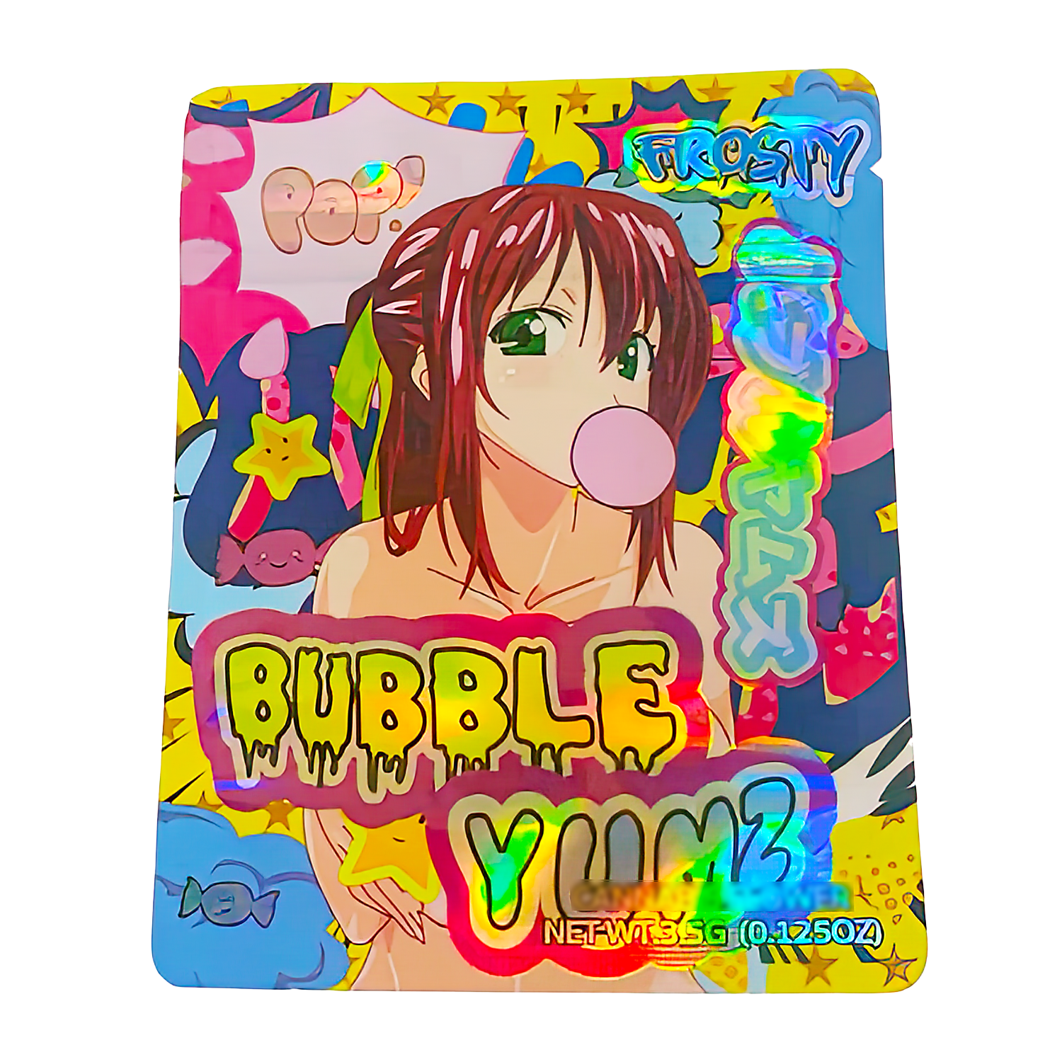 The Bubble Yumz edition features striking artwork and vibrant color designed to stand out in your Mylar Bag Collections. These Custom 3.5g Bags deliver durable, airtight protection that keeps food products fresh while showcasing a high-end, glossy finish.