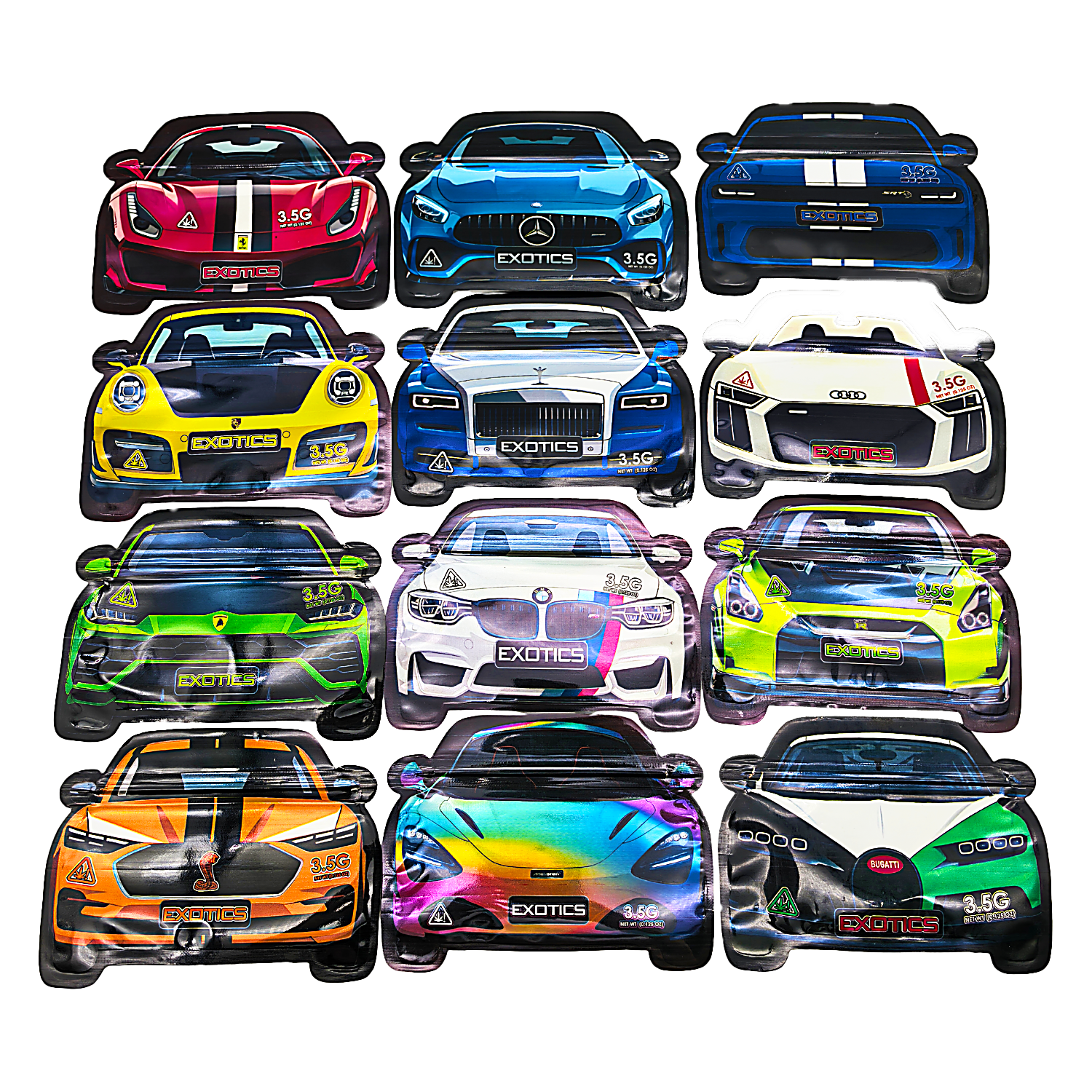 The New Car edition features a clean, vibrant shaped design that brings instant recognition to your packaging lineup. Each 3.5g shaped bag includes a secure zipper closure and heat-sealable top for extended freshness. These shaped mylar bags combine Durable protection with bold color and collectible style.