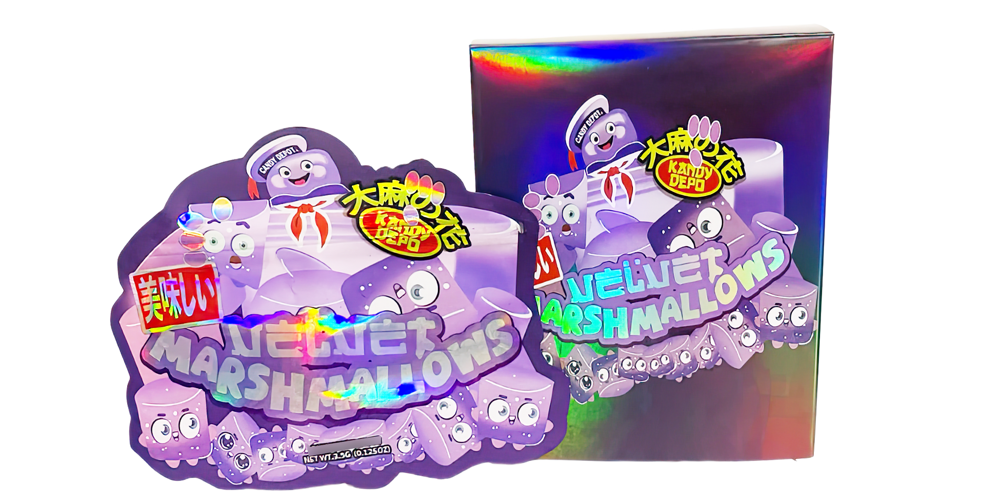 The Velvet Marshmallows edition features a clean, vibrant design that brings instant recognition to your packaging lineup. Each set includes a 3.5g shaped mylar Storage Bag and matching box for Durable presentation. These collectible packaging sets combine high-end protection with bold color and display-ready appeal.